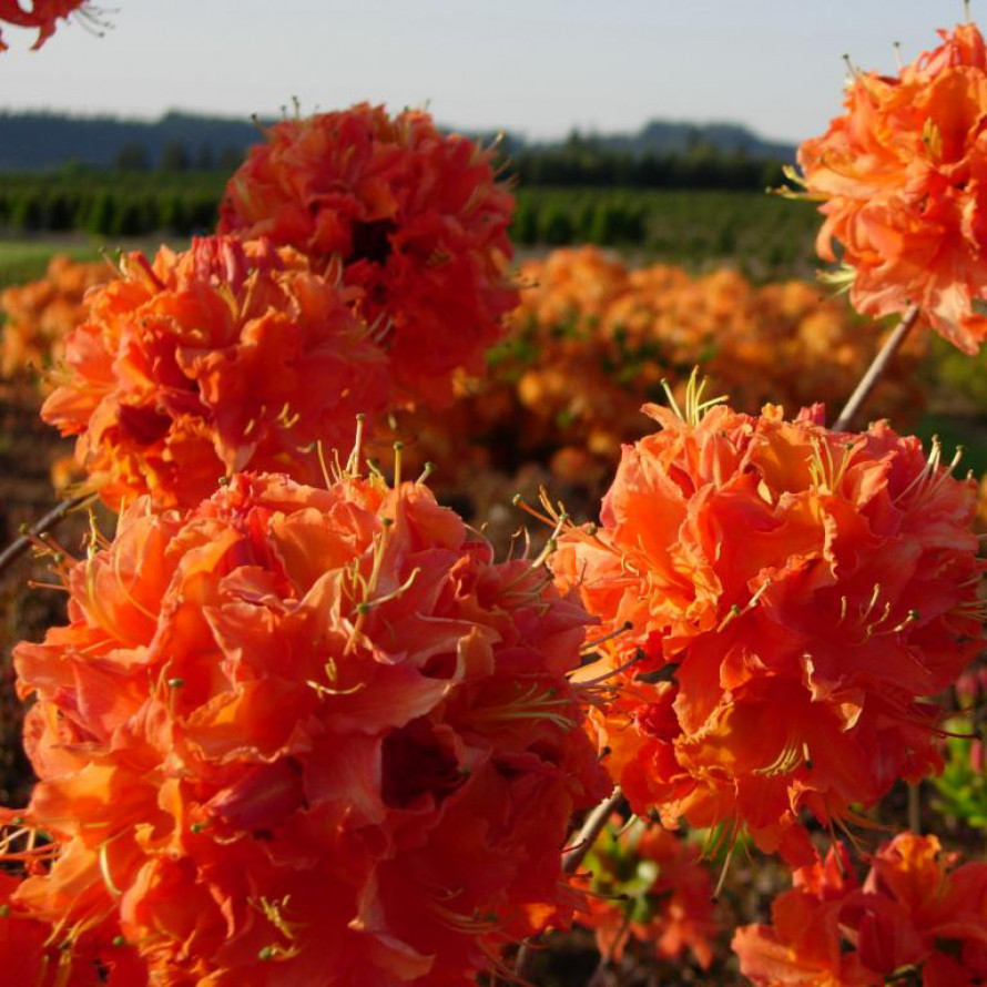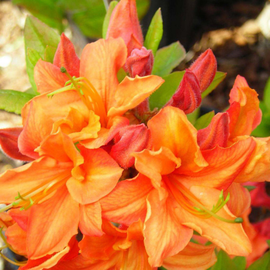 Роскошно цветущий сорт с яркими красно-оранжевыми широко открытыми, воронкообразными цветками. Лепестки с гофрированной кромкой. Верхний лепесток украшен почти полностью оранжево-жёлтым пятнистым рисунком. В соцветии до 10 слегка ароматных цветков. Каждый цветок диаметром 5 см.