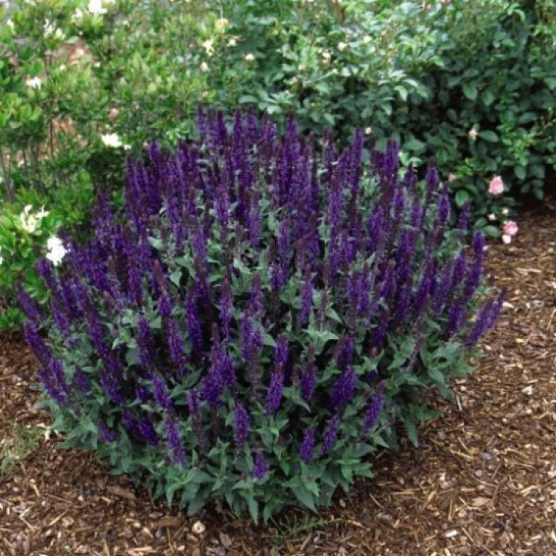 Яркий и довольно компактный сорт, высота растения не превышает 40 см. Побеги прочные, очень темные, украшены ароматными зелеными листьями. Цветет с июня до сентября насыщенно-фиолетовыми цветами, собранными в колосовидные соцветия