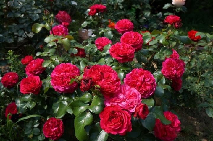 Роза Ред Леонардо да Винчи флорибунда, Imperial Rose - густой прямостоячий куст с аккуратным красивым абрисом, прочными, стройными и малошипными побегами. Стебли густо покрыты крупными кожистыми темно-зелеными глянцевыми листьями. Размеры куста не впечатляют: высота — 0,7-1 м, диаметр — 0,7 м, но сам куст выглядит очень декоративно, даже если цветение еще не наступило.