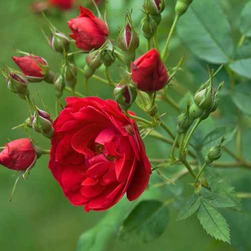 Цветки диаметром 7 см, полумахровые (12-16 лепестков), красные, в соцветиях бывает до 35 цветков.
