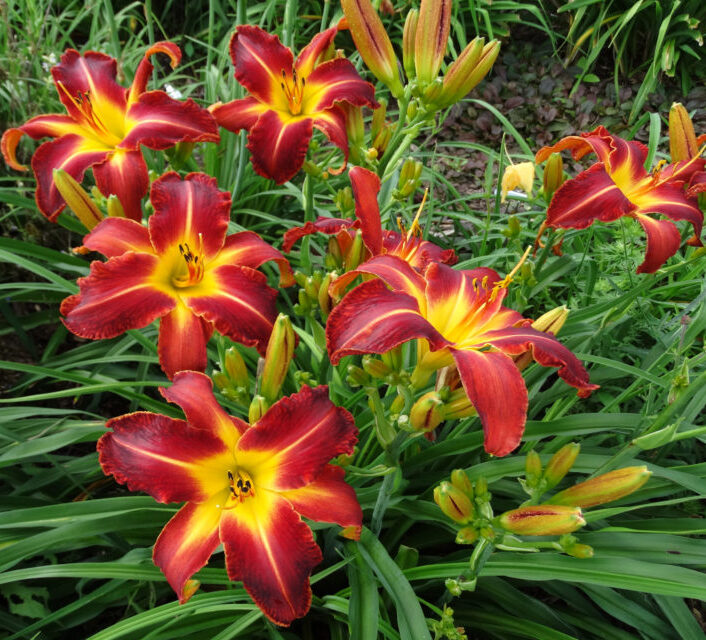 Взрослые кусты дают по 400 цветков за сезон. Цветки диаметром 8 см, тёмно-красные с жёлтой полоской по центру лепестка, с такой же каймой и жёлтым горлом.