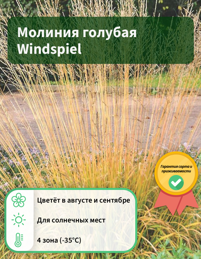 Выносит затопление, но не переносит зимнего вымокания. Хорошо растет как на кислых, так и на щелочных почвах. Сорт морозоустойчив. Высота молинии голубой Windspiel варьируется от 70 до 110 сантиметров. Листья узкие линейные, зеленые летом и желтые осенью. Цветет многолетник в июле-сентябре коричневым цветок, который собираются в метелки и смотрятся очень эффектно.