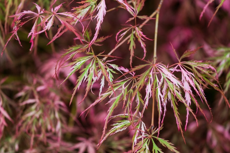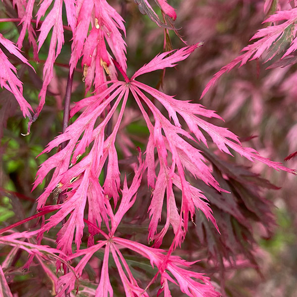 К 10-ти годам высота 100 см, ширина около 150 см. Листья зазубренные, глубоко рассечённые, весной - светло-зелёные с розово-пурпурными штрихами.