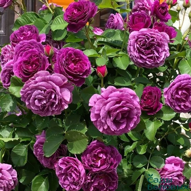 Достойное пополнение в группе «синих» роз. Цветки диаметром 8 см, махровые (20-39 лепестков), старинной формы, уникальной окраски, тёмно-сиреневые или фиолетовые со светло-синим оттенком, с золотистыми тычинками, в соцветиях. Лепестки в цветках красиво уложены. К концу цветения окраска становится более насыщенной.