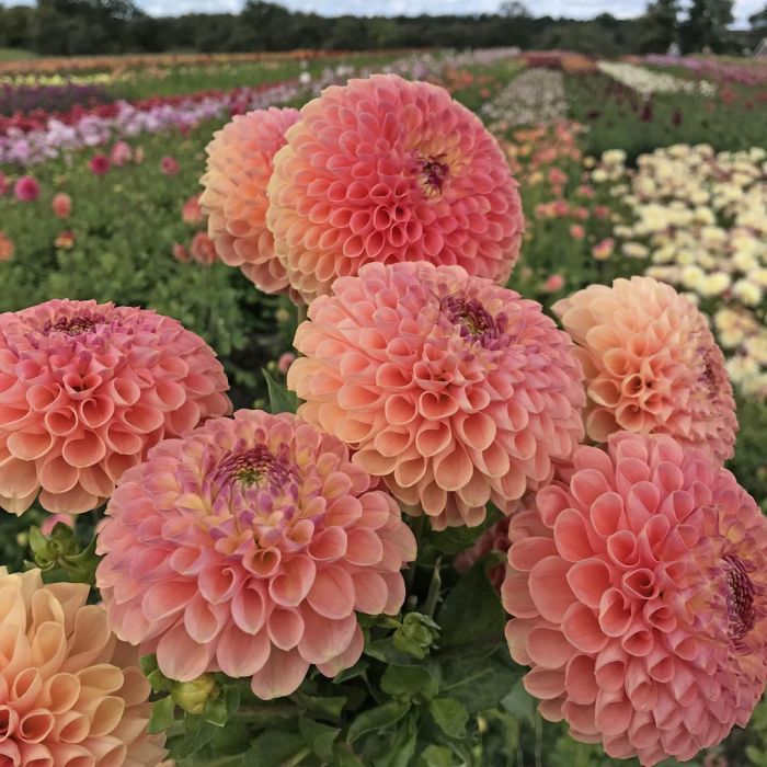 Цвет — персиково-абрикосовый с розовым штрихом по кромке и чуть более тёмным кольцом у центра, благодаря чему кажется, будто шар подсвечен изнутри. Лепестки свёрнуты внутрь ровной спиралью Ball-типа, диаметр обычно 10–12 см — форма чистая, без провалов в центре и с аккуратной округлой линией для букета.
