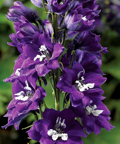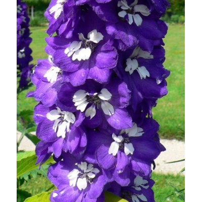 Дельфиниум Дельфина Дарк Блю Вайт Би – это неприхотливый, зимостойкий сорт, хорошо переносит засуху. У этих цветов очень экзотическая окраска – темно-синий цвет с белым центром, соцветие плотные, достигают 50 см, по форме напоминают фонтан. Цветение проходит с июля по август