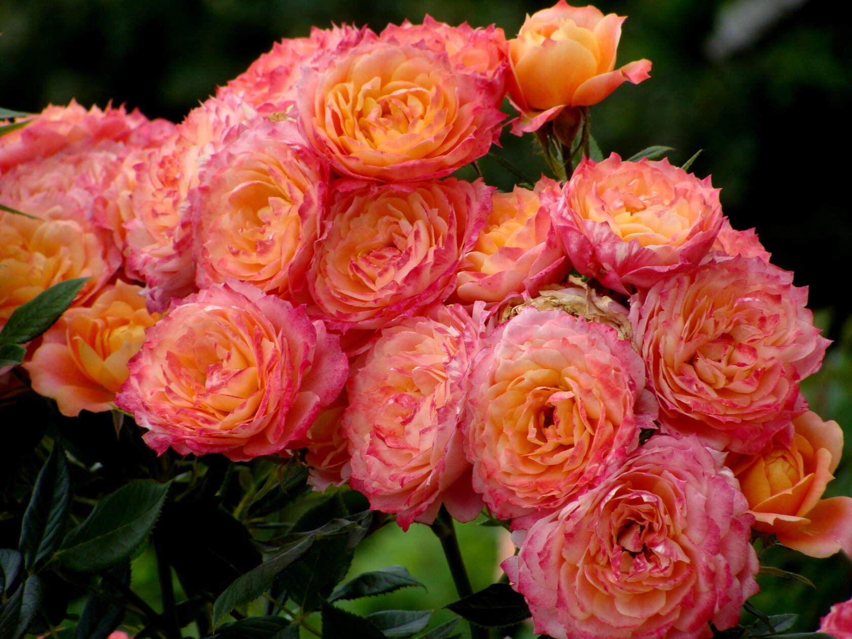 Цветки диаметром 7-8 см, махровые, красивой шаровидной формы, яркие, жёлто-оранжевые, постоянно меняют оттенки, собраны в соцветия по 3-5, при отцветании мумифицируются.