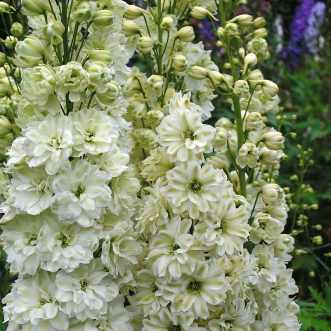 Дельфиниум Монинг Санрайз - многолетнее садовое растение. Шотландский гибрид высотой до 110 см. Цветки густомахровые белые с лаймовым центром, на прочных цветоносах. Соцветие достигает 80 см.