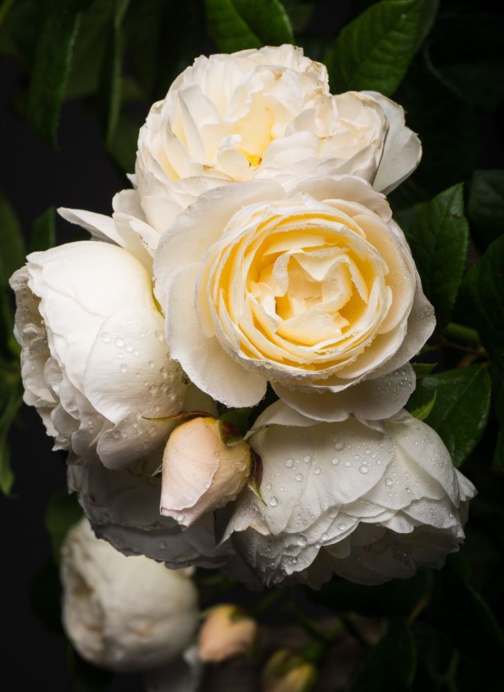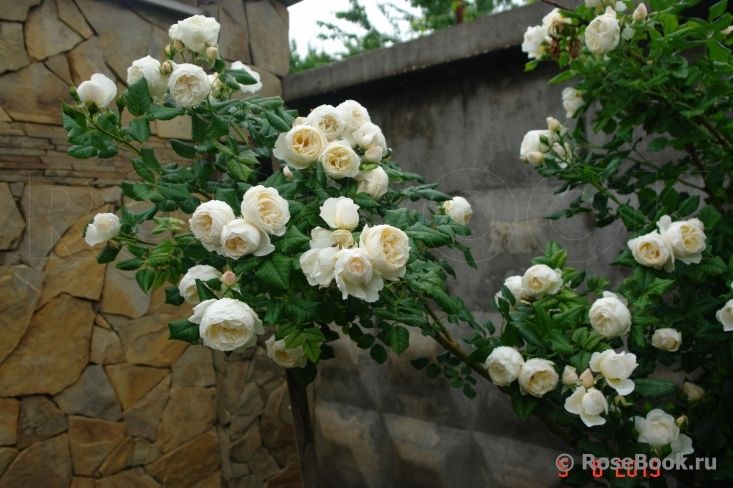Цветки диаметром 9-11 см, кремовые с яркими жёлтыми тычинками, романтичные, шарообразные, напоминают об известном сорте «Raubritter». Повторное цветение великолепное.