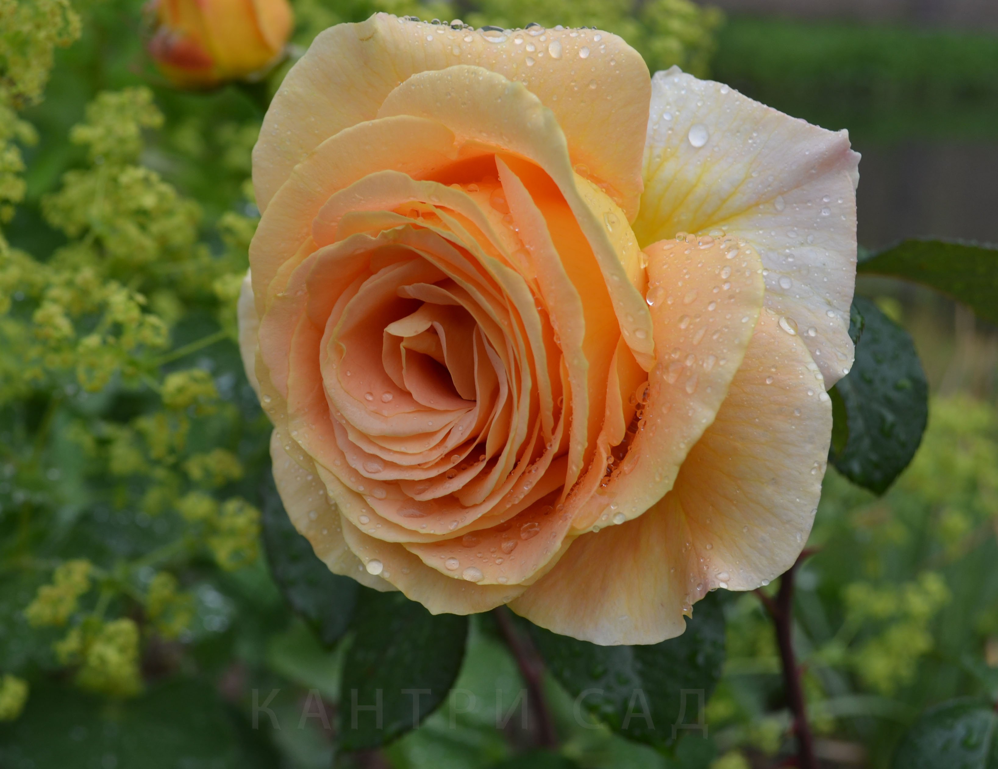 Цветки чудесного, тёплого, тёмно-жёлтого цвета, почти не бледнеют, диаметром 11-13 см, густомахровые, ностальгические, устойчивые к дождю.