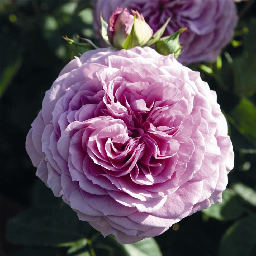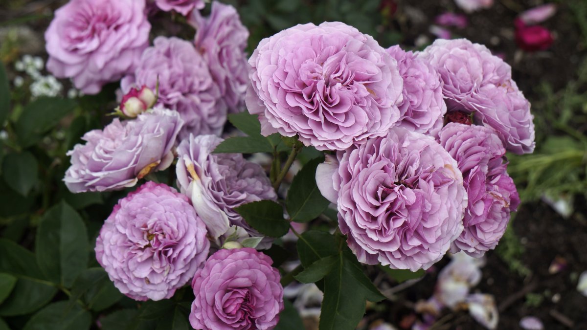 Цветки лавандово-сиреневые, густомахровые, розетковидные, диаметром 7-8 см, дождеустойчивые, в соцветиях по 3-5.
