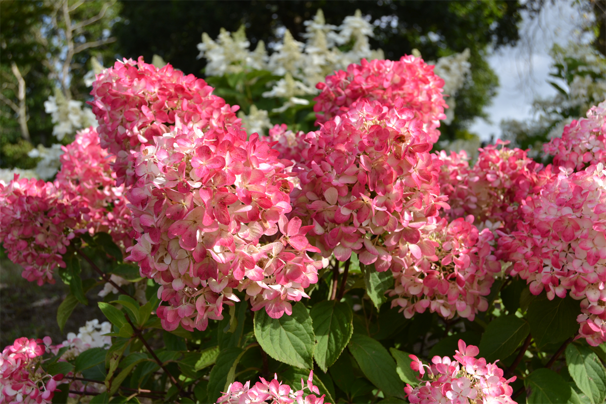 Крупные пышные до 30-40 см длиной. Форма широкопирамидальная, с настолько широким основанием и приплюснутым конусом, что кажется почти шарообразной. С начала июля цветки с большими чашелистиками раскрываются чисто белым цветом, а затем быстро розовеют и уже через две недели приобретают насыщенный красный цвет, который к августу становится еще более интенсивным, эффектным пурпурно-красным и держится на протяжении нескольких недель.
